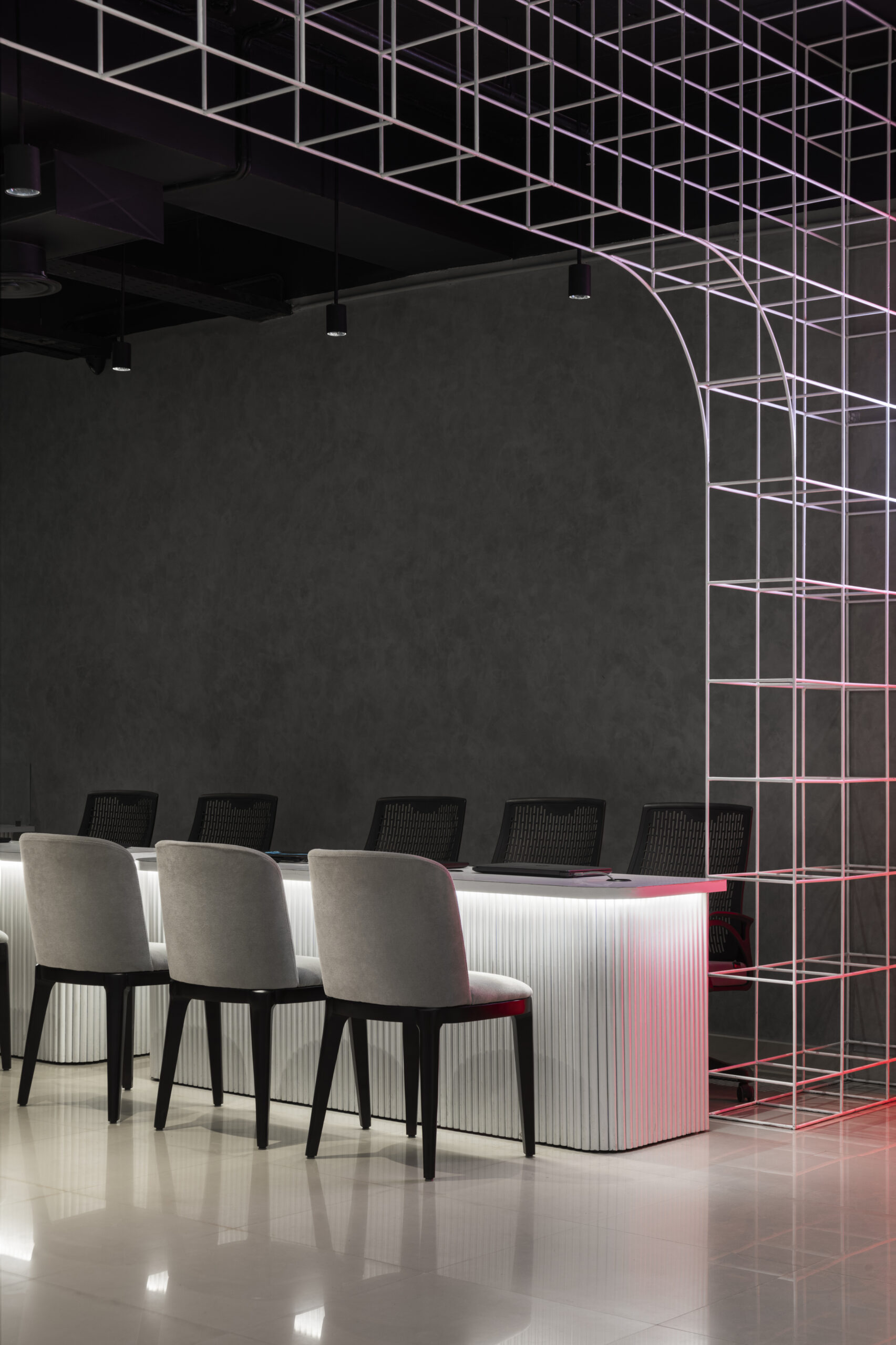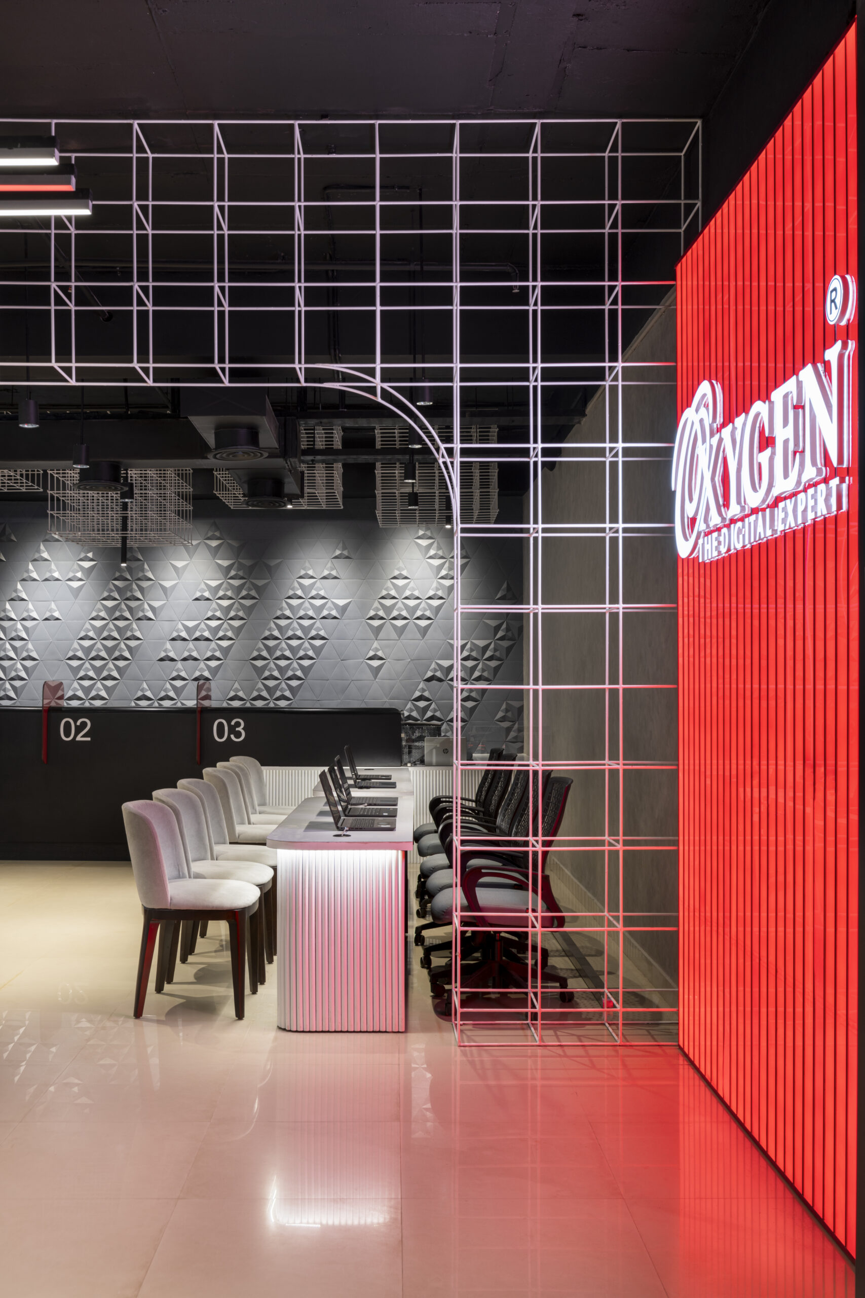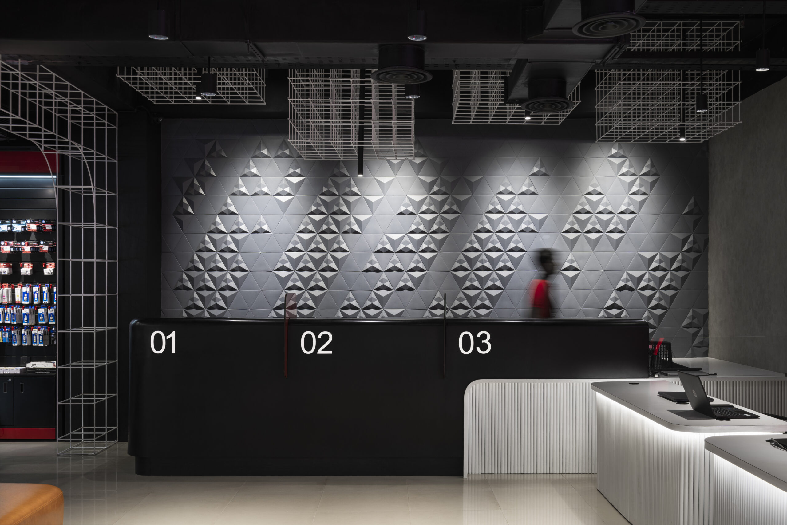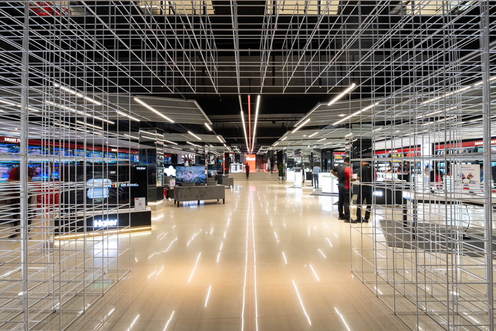This flagship space combines retail, workspace, and services under one roof. The entry is marked by a striking mesh that draws from the concept of a celestial cloud – subtly tying into the brand’s futuristic outlook. Inside, the layout is designed to guide customers naturally through experience zones, display areas, and service sections. The upper levels house administrative and support spaces, allowing smooth backend operations while keeping the focus on customer engagement. With a thoughtful balance of design and function, the space serves as both a brand statement and a customer-first environment.