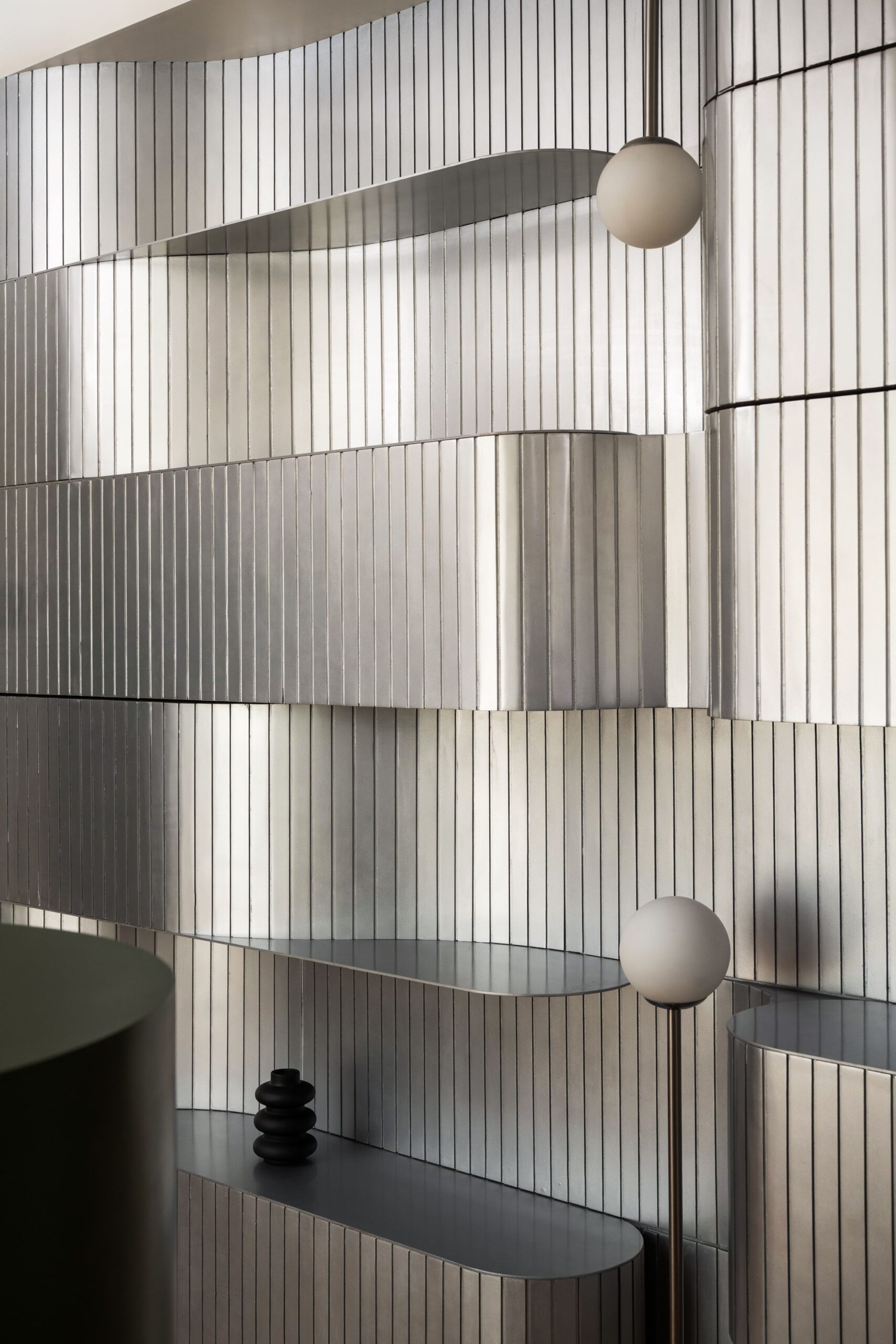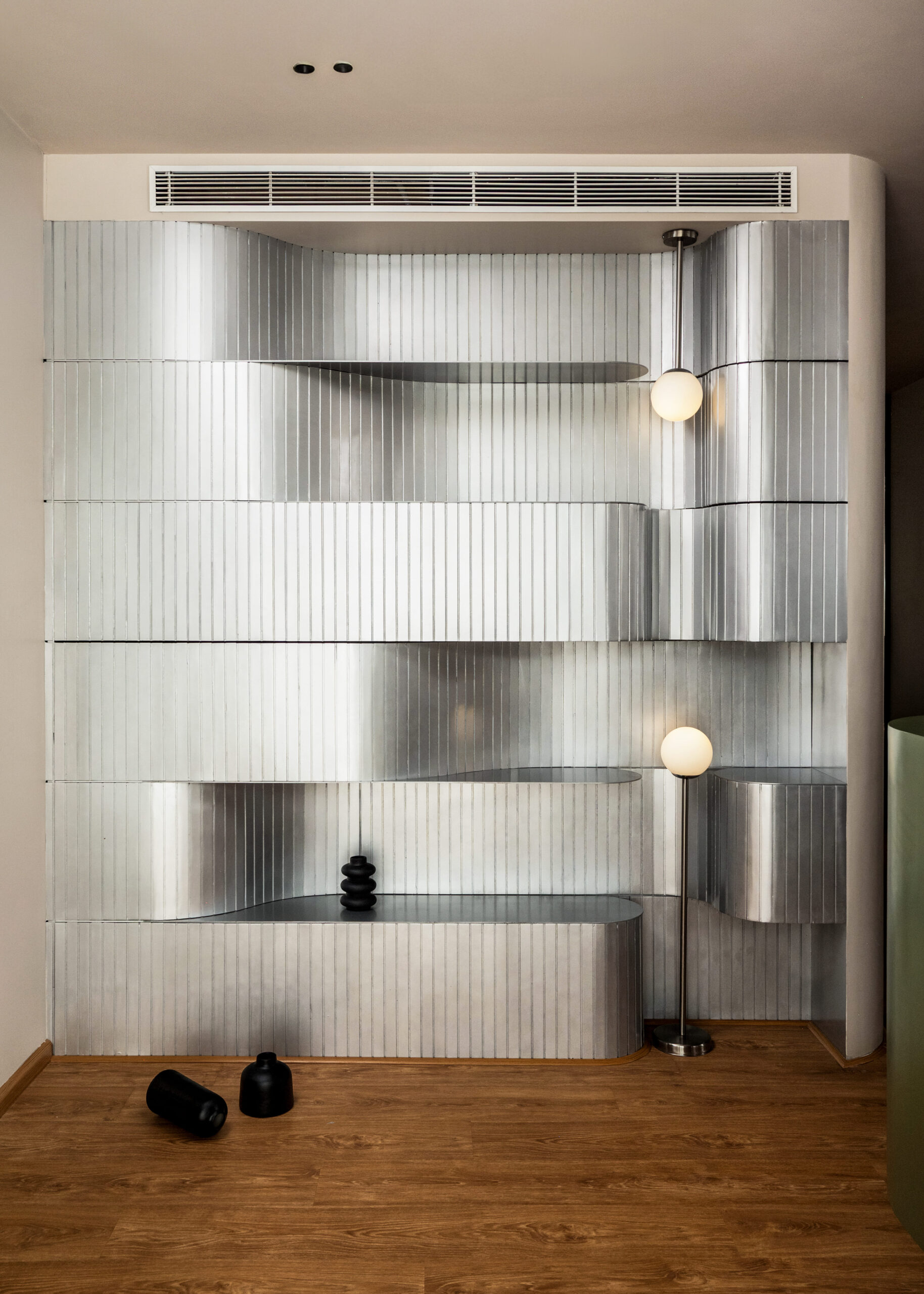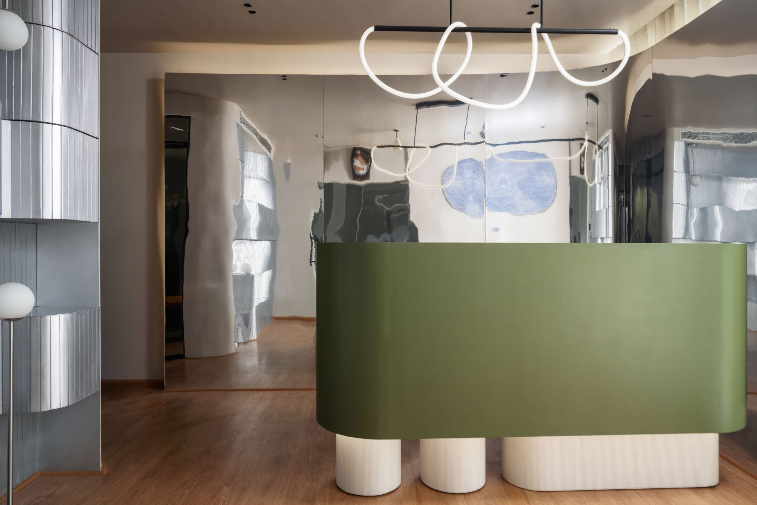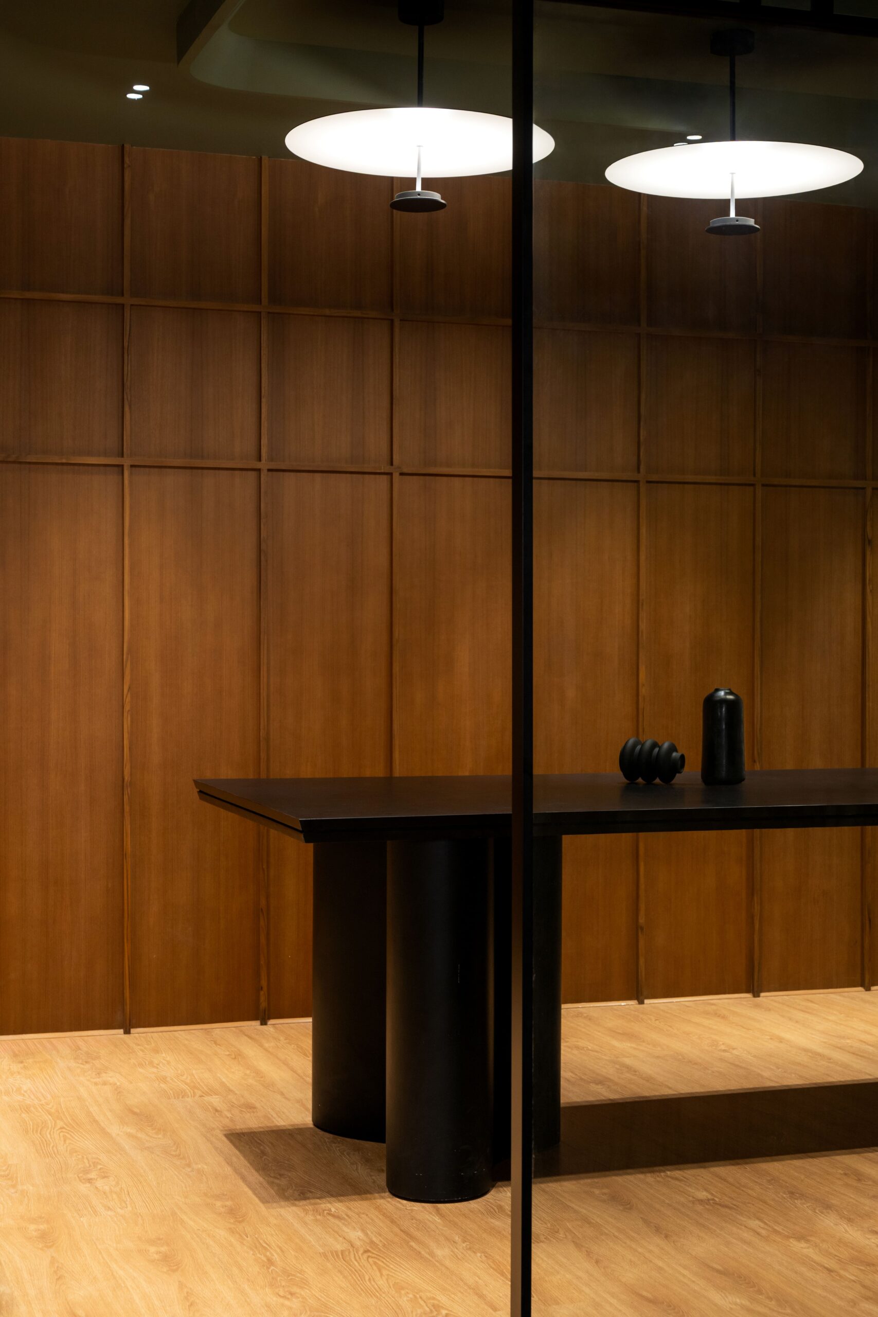 The meeting rooms, enclosed in glass, reinforce transparency and collaborative exchange – values essential to an organization shaping interactive learning environments. A sculptural reception desk and reflective wall finishes create an inviting yet modern welcome area that speaks to both professionalism and imagination.