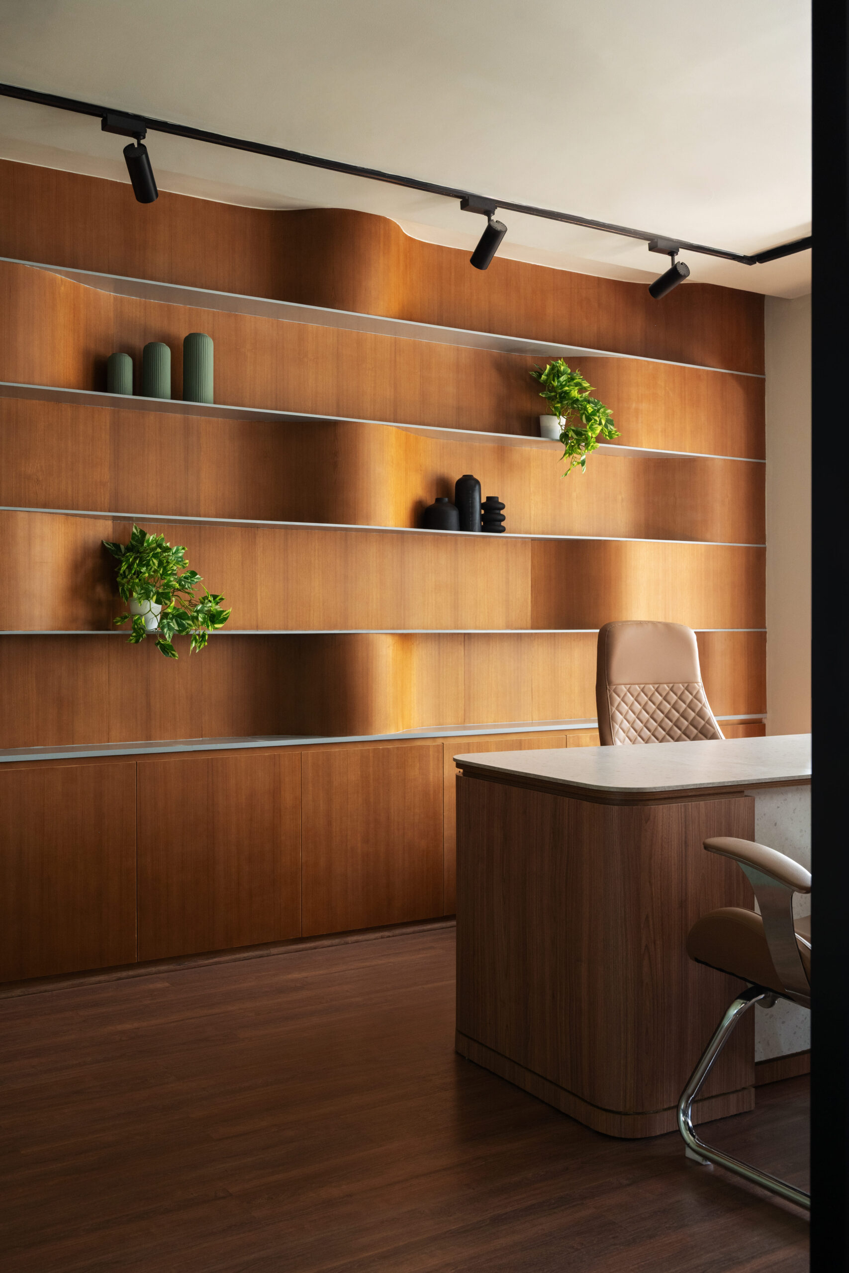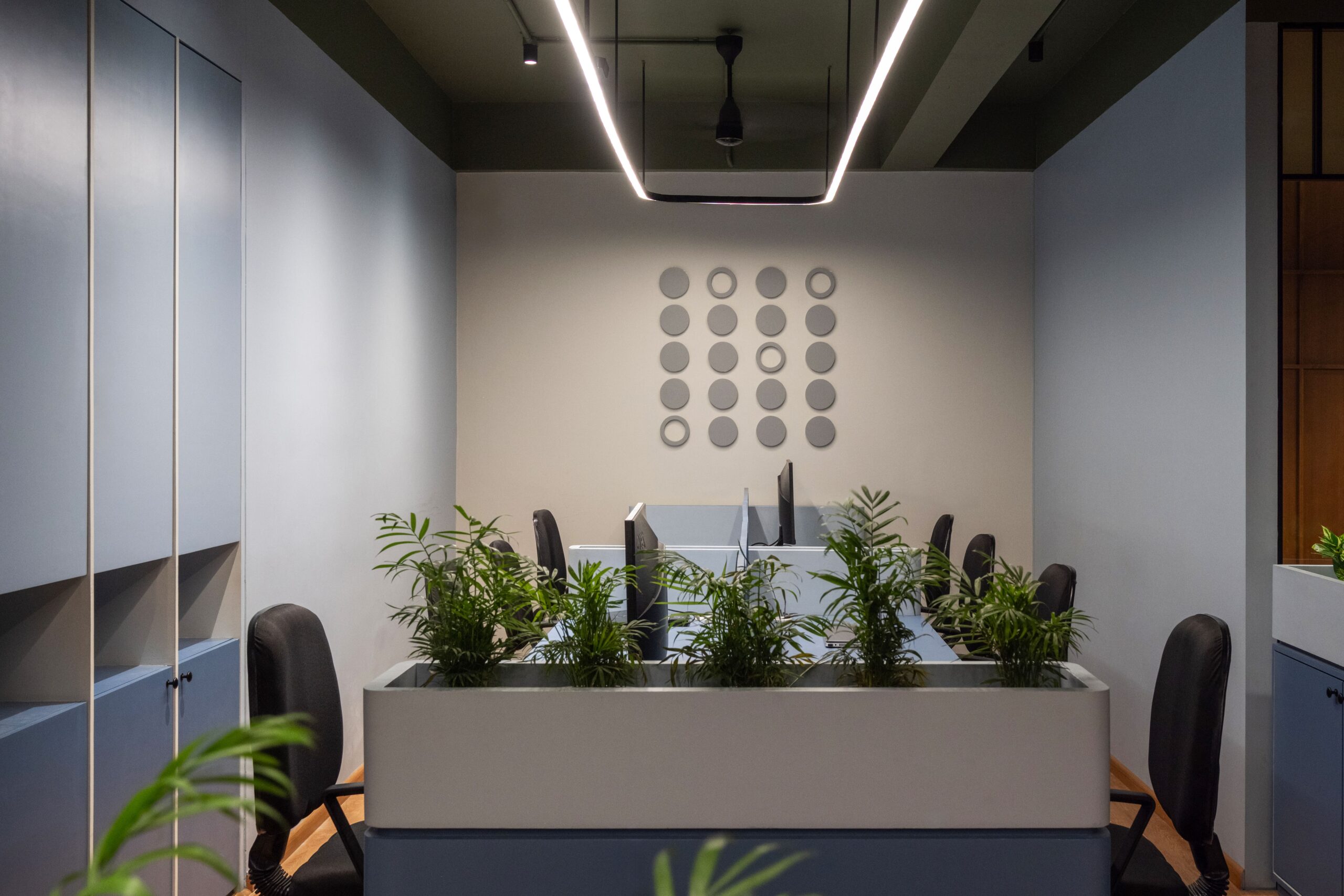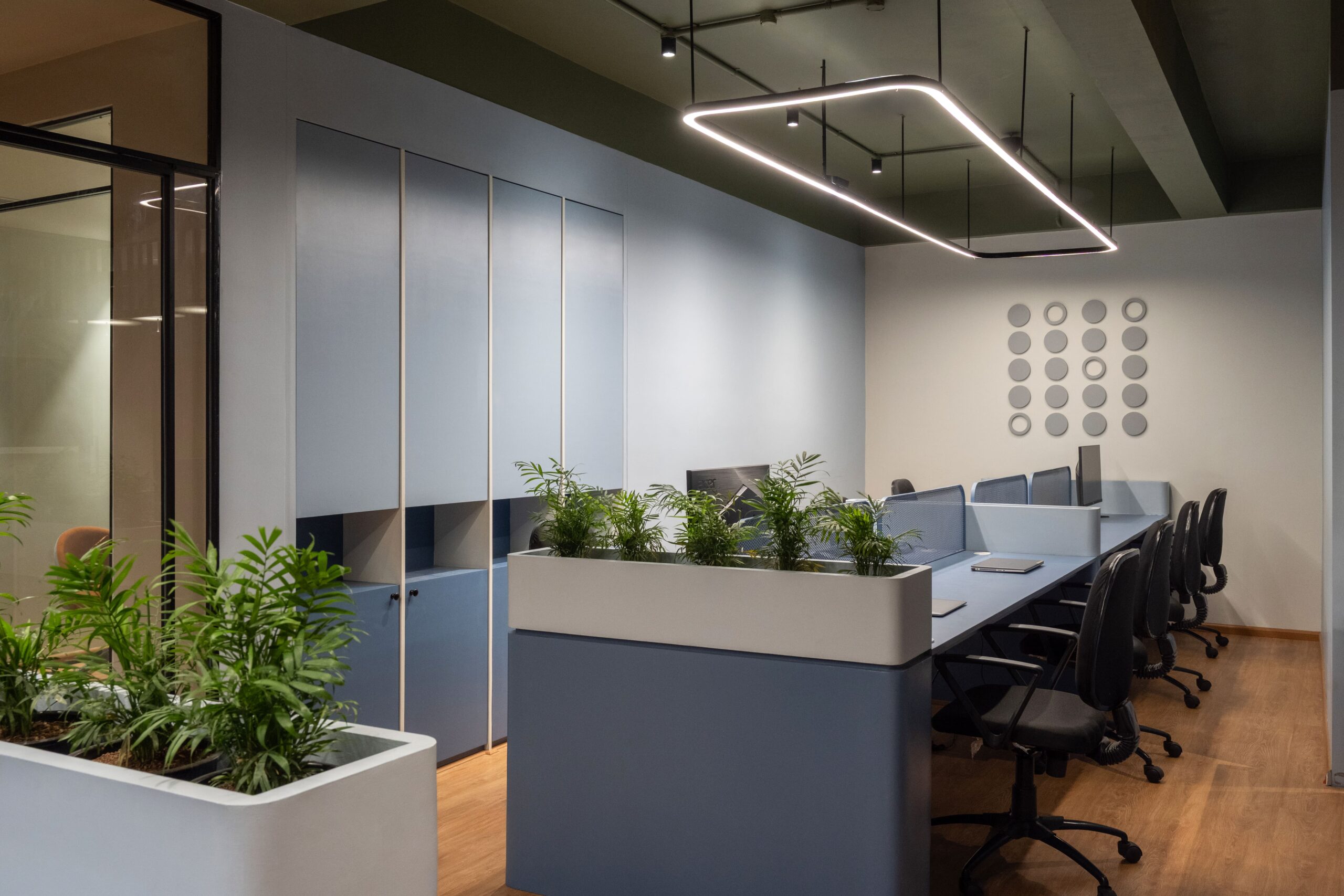 Designed for a company at the forefront of educational innovation, this office interior blends clarity with creativity. The space is composed using a calming sage green palette and warm wood flooring, cultivating a sense of focus and ease. Workstations are organized with soft, curved partitions that double as planters – introducing greenery as a quiet nod to growth and learning.