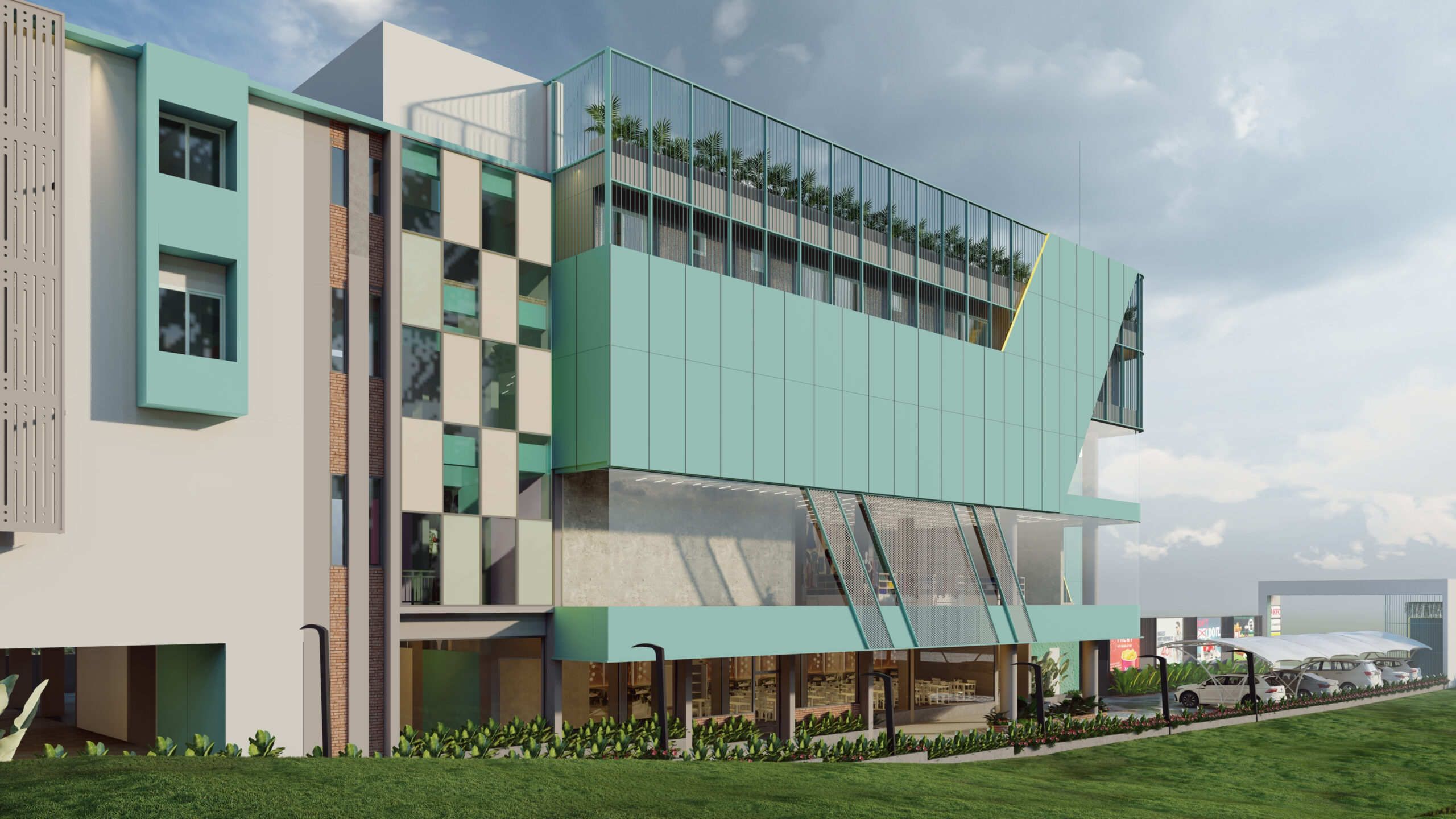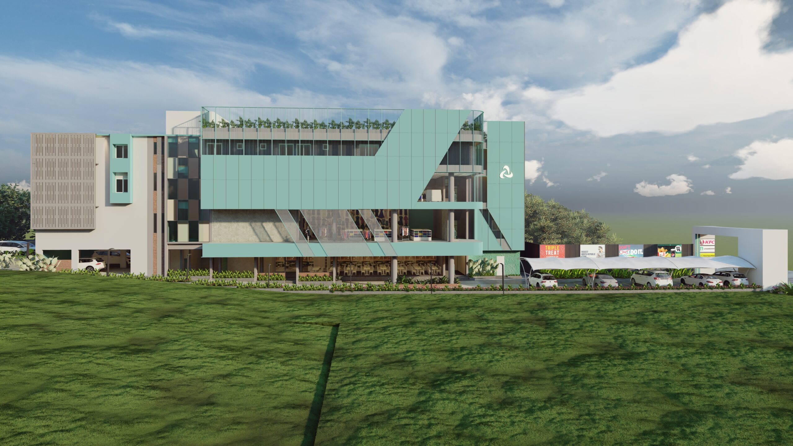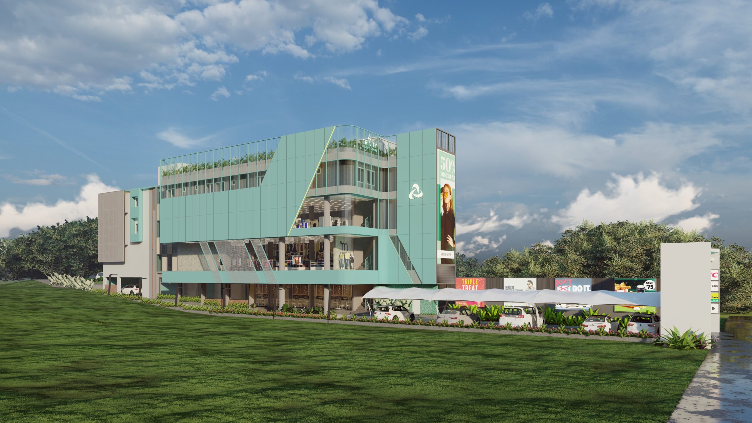 Situated on the outskirts of Kottayam, this building is a mixed-use commercial building that blends retail vibrancy with urban living. The ground, first, and second floors are dedicated to commercial spaces—ideal for showrooms, shops, and boutiques—while the top floor is designed as a premium residential unit with terrace greenery, offering a private, elevated retreat. The building features a sleek glass-and-metal facade with vertical fins and subtle curves that break the massing. The structure integrates landscaping and shaded parking at the front, making it both inviting and functional.