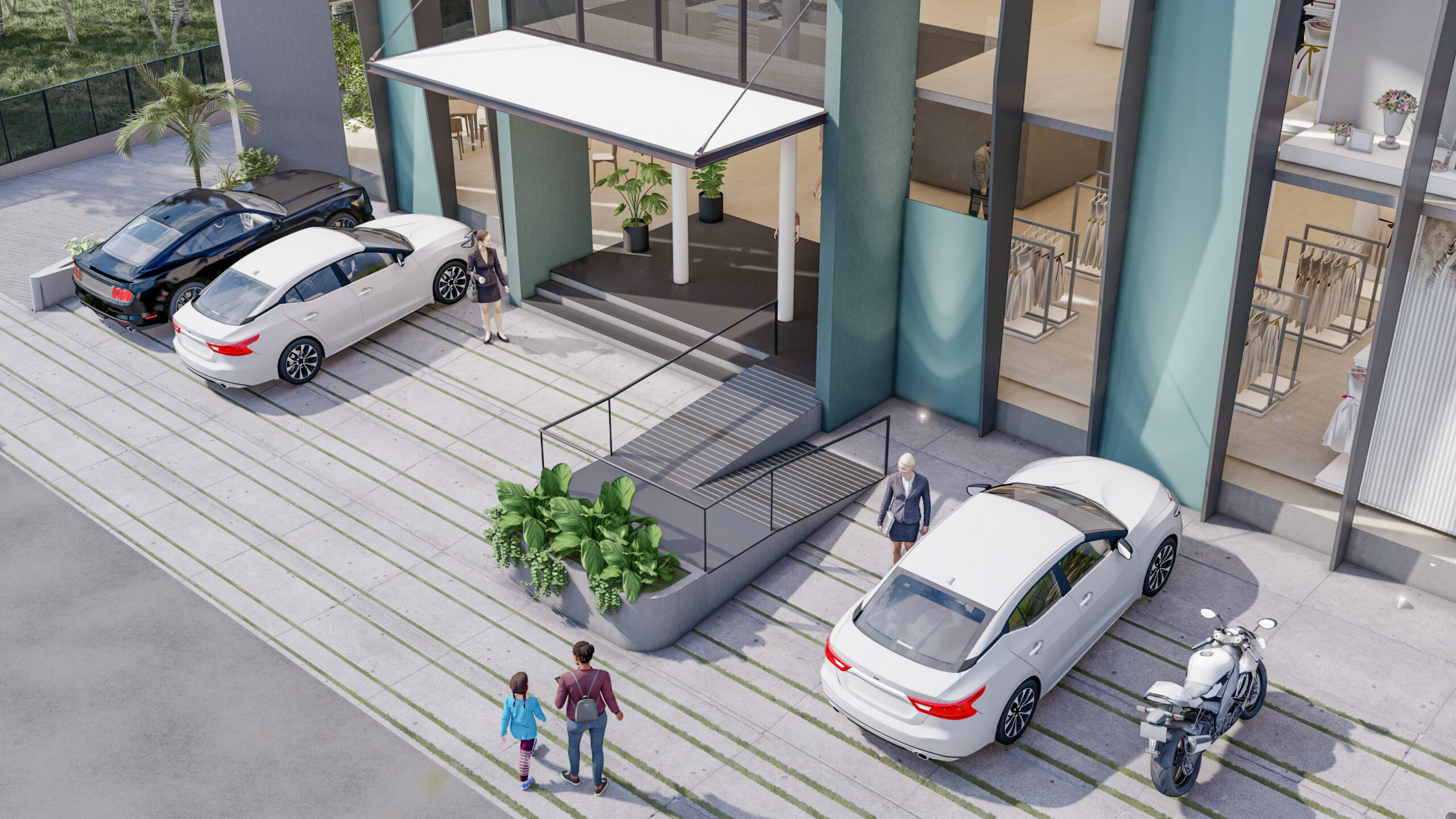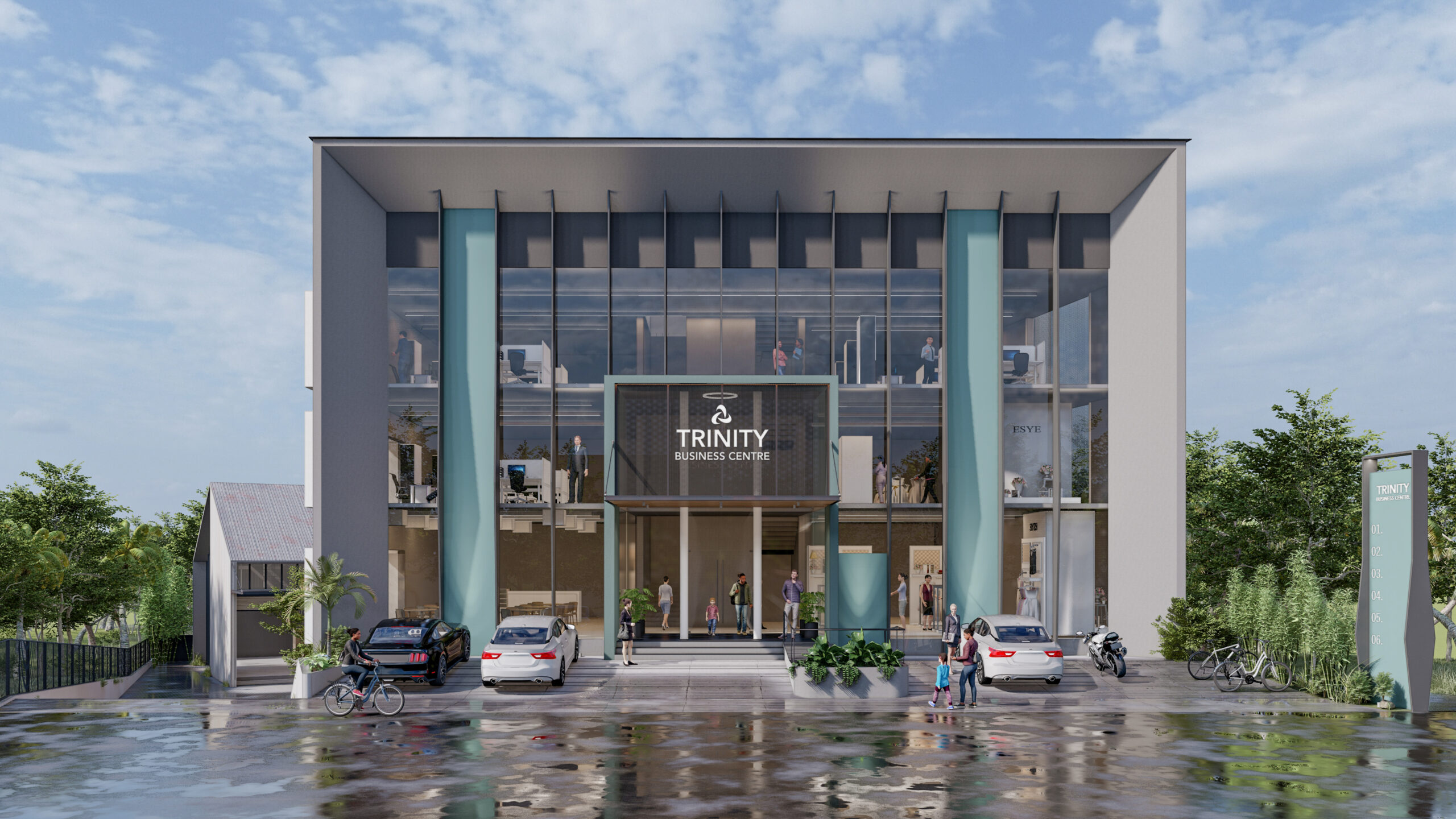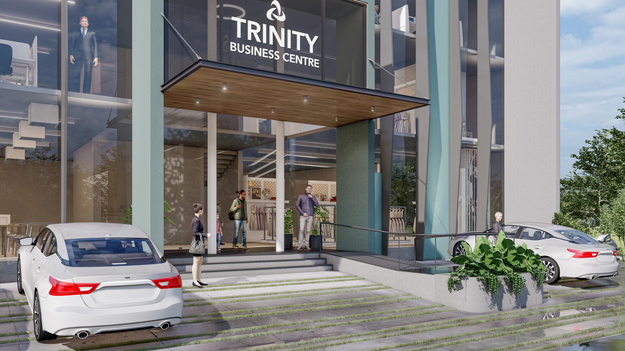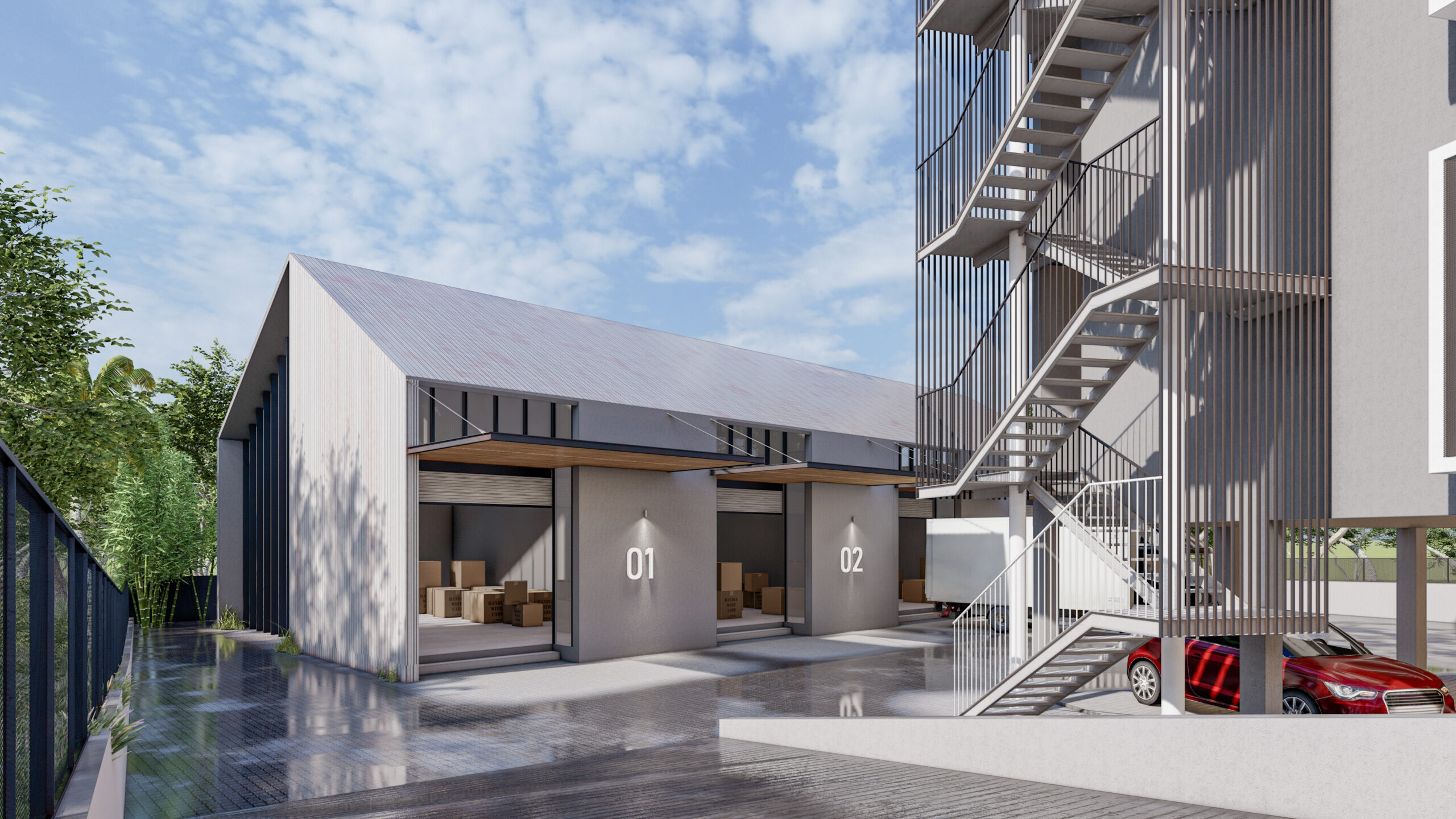 Located in the peaceful outskirts of Kottayam, this commercial building is designed to stand out with its bold vertical fins, expansive glass frontage, and a contemporary form that plays with rhythm and depth. The main block opens out to a clean forecourt with defined access and parking, while the rear of the plot smartly accommodates a container warehouse – creating a balance between visual appeal and operational efficiency. The design brings together modern aesthetics with real-world function, tailored for growing businesses.