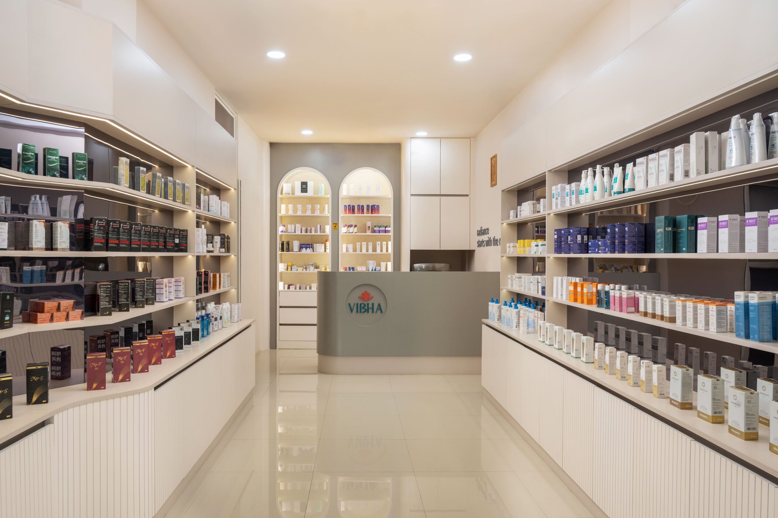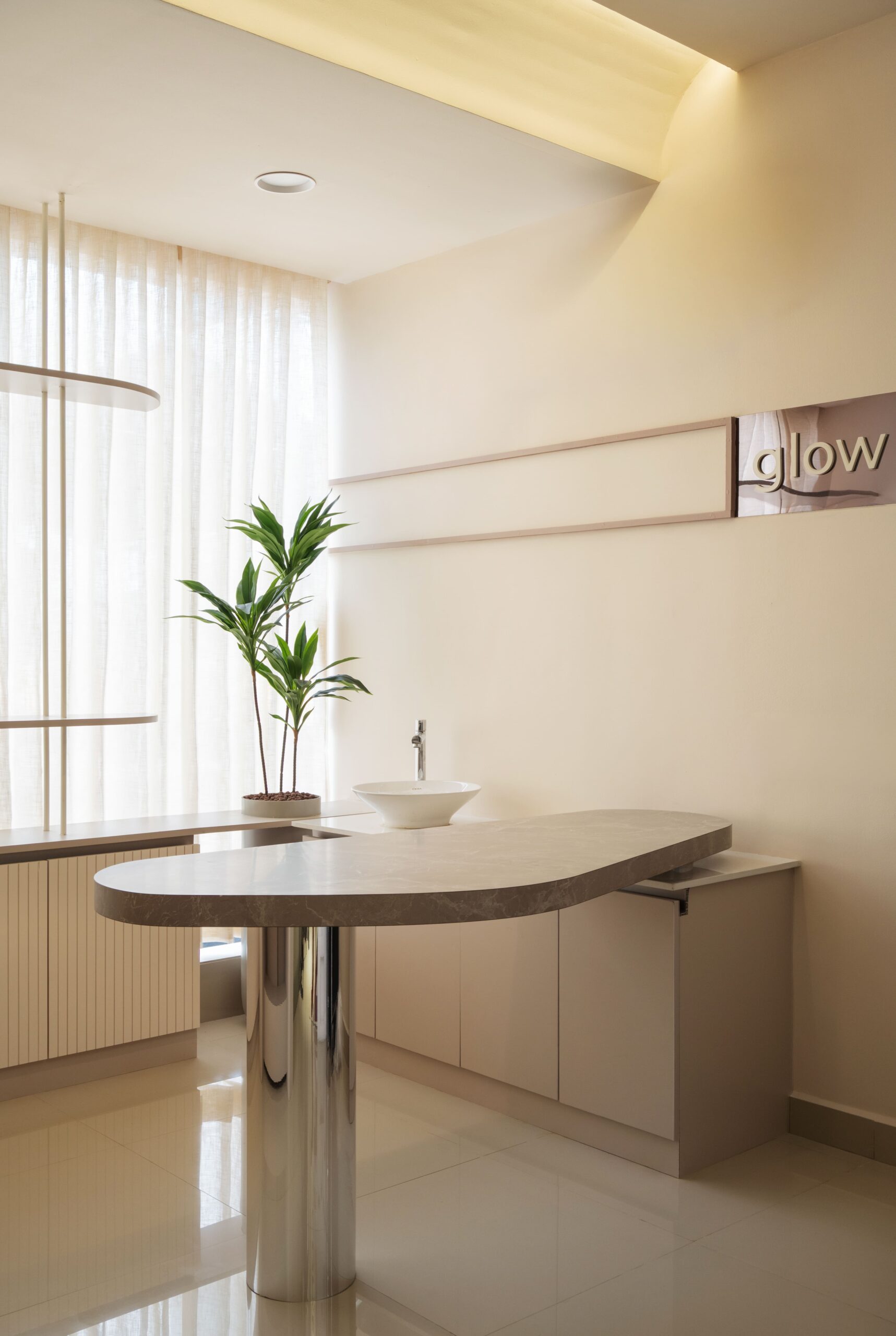 The interior design of Vibha Skin Clinic embodies a calm, refined elegance that reflects the clinic’s commitment to wellness and rejuvenation. A soothing neutral palette of soft beiges and warm whites creates a serene backdrop, complemented by clean architectural lines and carefully curated textures.